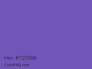 Hex #7255b8 Color is a normal indigo color and the nearest color is Fuchsia Blue #7a58c1. Hex code #7255b8 and RGB value is rgb(114,85,184). In RGB color space, this color is composed of 45% red, 33% green, 72% blue, In CMYK color space, this color is composed of 38% cyan, 54% magenta, 0% yellow , 28% black , In HSL color space, this color has a hue angle of 258° , 41% saturation and 53% lightness.