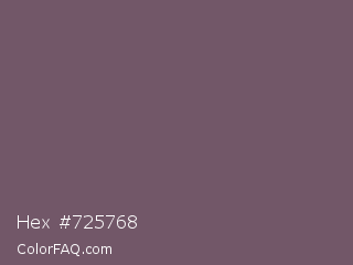 Hex #725768 Color is a normal magenta color and the nearest color is Scorpion #695f62. Hex code #725768 and RGB value is rgb(114,87,104). In RGB color space, this color is composed of 45% red, 34% green, 41% blue, In CMYK color space, this color is composed of 0% cyan, 24% magenta, 9% yellow , 55% black , In HSL color space, this color has a hue angle of 322° , 13% saturation and 39% lightness.