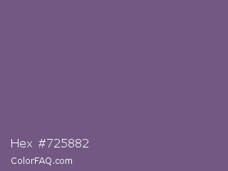 Hex #725882 Color is a normal purple color and the nearest color is Dolphin #646077. Hex code #725882 and RGB value is rgb(114,88,130). In RGB color space, this color is composed of 45% red, 35% green, 51% blue, In CMYK color space, this color is composed of 12% cyan, 32% magenta, 0% yellow , 49% black , In HSL color space, this color has a hue angle of 277° , 19% saturation and 43% lightness.