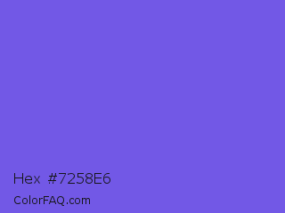 Hex #7258e6 Color is a light indigo color and the nearest color is Medium Slate Blue #7b68ee. Hex code #7258e6 and RGB value is rgb(114,88,230). In RGB color space, this color is composed of 45% red, 35% green, 90% blue, In CMYK color space, this color is composed of 50% cyan, 62% magenta, 0% yellow , 10% black , In HSL color space, this color has a hue angle of 251° , 74% saturation and 62% lightness.