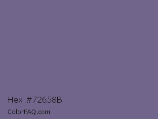 Hex #72658b Color is a normal violet color and the nearest color is Rum #796989. Hex code #72658b and RGB value is rgb(114,101,139). In RGB color space, this color is composed of 45% red, 40% green, 55% blue, In CMYK color space, this color is composed of 18% cyan, 27% magenta, 0% yellow , 45% black , In HSL color space, this color has a hue angle of 261° , 16% saturation and 47% lightness.