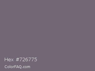 Hex #726775 Color is a normal purple color and the nearest color is Old Lavender #796878. Hex code #726775 and RGB value is rgb(114,103,117). In RGB color space, this color is composed of 45% red, 40% green, 46% blue, In CMYK color space, this color is composed of 3% cyan, 12% magenta, 0% yellow , 54% black , In HSL color space, this color has a hue angle of 287° , 6% saturation and 43% lightness.