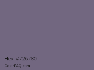 Hex #726780 Color is a normal violet color and the nearest color is Old Lavender #796878. Hex code #726780 and RGB value is rgb(114,103,128). In RGB color space, this color is composed of 45% red, 40% green, 50% blue, In CMYK color space, this color is composed of 11% cyan, 20% magenta, 0% yellow , 50% black , In HSL color space, this color has a hue angle of 266° , 11% saturation and 45% lightness.