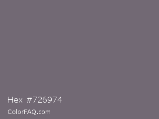 Hex #726974 Color is a normal purple color and the nearest color is Old Lavender #796878. Hex code #726974 and RGB value is rgb(114,105,116). In RGB color space, this color is composed of 45% red, 41% green, 45% blue, In CMYK color space, this color is composed of 2% cyan, 9% magenta, 0% yellow , 55% black , In HSL color space, this color has a hue angle of 289° , 5% saturation and 43% lightness.