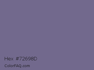 Hex #72698d Color is a normal indigo color and the nearest color is Rum #796989. Hex code #72698d and RGB value is rgb(114,105,141). In RGB color space, this color is composed of 45% red, 41% green, 55% blue, In CMYK color space, this color is composed of 19% cyan, 26% magenta, 0% yellow , 45% black , In HSL color space, this color has a hue angle of 255° , 15% saturation and 48% lightness.