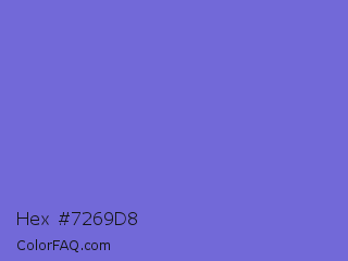 Hex #7269d8 Color is a light indigo color and the nearest color is Blue Marguerite #7666c6. Hex code #7269d8 and RGB value is rgb(114,105,216). In RGB color space, this color is composed of 45% red, 41% green, 85% blue, In CMYK color space, this color is composed of 47% cyan, 51% magenta, 0% yellow , 15% black , In HSL color space, this color has a hue angle of 245° , 59% saturation and 63% lightness.