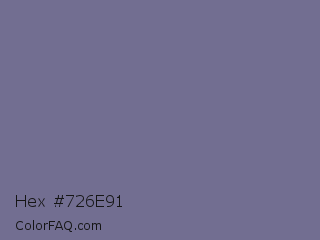 Hex #726e91 Color is a normal indigo color and the nearest color is Rhythm #777696. Hex code #726e91 and RGB value is rgb(114,110,145). In RGB color space, this color is composed of 45% red, 43% green, 57% blue, In CMYK color space, this color is composed of 21% cyan, 24% magenta, 0% yellow , 43% black , In HSL color space, this color has a hue angle of 247° , 14% saturation and 50% lightness.