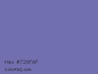 Hex #726faf Color is a normal indigo color and the nearest color is Deluge #7563a8. Hex code #726faf and RGB value is rgb(114,111,175). In RGB color space, this color is composed of 45% red, 44% green, 69% blue, In CMYK color space, this color is composed of 35% cyan, 37% magenta, 0% yellow , 31% black , In HSL color space, this color has a hue angle of 243° , 29% saturation and 56% lightness.