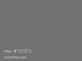 Hex #727071 Color is a normal rose color and the nearest color is Nickel #727472. Hex code #727071 and RGB value is rgb(114,112,113). In RGB color space, this color is composed of 45% red, 44% green, 44% blue, In CMYK color space, this color is composed of 0% cyan, 2% magenta, 1% yellow , 55% black , In HSL color space, this color has a hue angle of 330° , 1% saturation and 44% lightness.