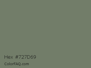 Hex #727d69 Color is a normal green color and the nearest color is Limed Ash #747d63. Hex code #727d69 and RGB value is rgb(114,125,105). In RGB color space, this color is composed of 45% red, 49% green, 41% blue, In CMYK color space, this color is composed of 9% cyan, 0% magenta, 16% yellow , 51% black , In HSL color space, this color has a hue angle of 93° , 9% saturation and 45% lightness.