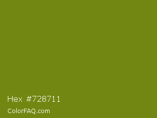 Hex #728711 Color is a dark lime color and the nearest color is Trendy Green #7c881a. Hex code #728711 and RGB value is rgb(114,135,17). In RGB color space, this color is composed of 45% red, 53% green, 7% blue, In CMYK color space, this color is composed of 16% cyan, 0% magenta, 87% yellow , 47% black , In HSL color space, this color has a hue angle of 71° , 78% saturation and 30% lightness.