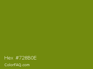 Hex #728b0e Color is a dark lime color and the nearest color is Trendy Green #7c881a. Hex code #728b0e and RGB value is rgb(114,139,14). In RGB color space, this color is composed of 45% red, 55% green, 5% blue, In CMYK color space, this color is composed of 18% cyan, 0% magenta, 90% yellow , 45% black , In HSL color space, this color has a hue angle of 72° , 82% saturation and 30% lightness.