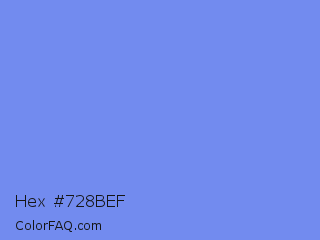 Hex #728bef Color is a light blue color and the nearest color is Cornflower Blue #6495ed. Hex code #728bef and RGB value is rgb(114,139,239). In RGB color space, this color is composed of 45% red, 55% green, 94% blue, In CMYK color space, this color is composed of 52% cyan, 42% magenta, 0% yellow , 6% black , In HSL color space, this color has a hue angle of 228° , 80% saturation and 69% lightness.
