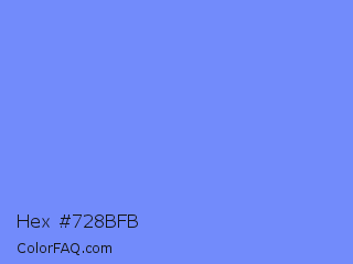 Hex #728bfb Color is a light blue color and the nearest color is Cornflower Blue #6495ed. Hex code #728bfb and RGB value is rgb(114,139,251). In RGB color space, this color is composed of 45% red, 55% green, 98% blue, In CMYK color space, this color is composed of 55% cyan, 45% magenta, 0% yellow , 2% black , In HSL color space, this color has a hue angle of 229° , 94% saturation and 72% lightness.