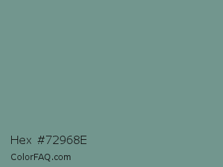 Hex #72968e Color is a normal cyan color and the nearest color is Juniper #6d9292. Hex code #72968e and RGB value is rgb(114,150,142). In RGB color space, this color is composed of 45% red, 59% green, 56% blue, In CMYK color space, this color is composed of 24% cyan, 0% magenta, 5% yellow , 41% black , In HSL color space, this color has a hue angle of 167° , 15% saturation and 52% lightness.