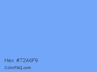 Hex #72a6f9 Color is a light blue color and the nearest color is French Sky Blue #77b5fe. Hex code #72a6f9 and RGB value is rgb(114,166,249). In RGB color space, this color is composed of 45% red, 65% green, 98% blue, In CMYK color space, this color is composed of 54% cyan, 33% magenta, 0% yellow , 2% black , In HSL color space, this color has a hue angle of 217° , 92% saturation and 71% lightness.