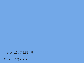 Hex #72a8e8 Color is a light blue color and the nearest color is Little Boy Blue #6ca0dc. Hex code #72a8e8 and RGB value is rgb(114,168,232). In RGB color space, this color is composed of 45% red, 66% green, 91% blue, In CMYK color space, this color is composed of 51% cyan, 28% magenta, 0% yellow , 9% black , In HSL color space, this color has a hue angle of 213° , 72% saturation and 68% lightness.