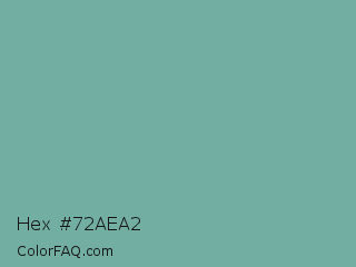 Hex #72aea2 Color is a normal cyan color and the nearest color is Green Sheen #6eaea1. Hex code #72aea2 and RGB value is rgb(114,174,162). In RGB color space, this color is composed of 45% red, 68% green, 64% blue, In CMYK color space, this color is composed of 34% cyan, 0% magenta, 7% yellow , 32% black , In HSL color space, this color has a hue angle of 168° , 27% saturation and 56% lightness.