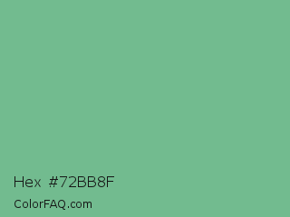 Hex #72bb8f Color is a normal green color and the nearest color is Silver Tree #66b58f. Hex code #72bb8f and RGB value is rgb(114,187,143). In RGB color space, this color is composed of 45% red, 73% green, 56% blue, In CMYK color space, this color is composed of 39% cyan, 0% magenta, 24% yellow , 27% black , In HSL color space, this color has a hue angle of 144° , 35% saturation and 59% lightness.