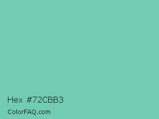 Hex #72cbb3 Color is a light cyan color and the nearest color is Downy #6fd0c5. Hex code #72cbb3 and RGB value is rgb(114,203,179). In RGB color space, this color is composed of 45% red, 80% green, 70% blue, In CMYK color space, this color is composed of 44% cyan, 0% magenta, 12% yellow , 20% black , In HSL color space, this color has a hue angle of 164° , 46% saturation and 62% lightness.