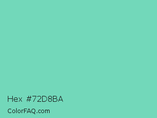 Hex #72d8ba Color is a light green color and the nearest color is Downy #6fd0c5. Hex code #72d8ba and RGB value is rgb(114,216,186). In RGB color space, this color is composed of 45% red, 85% green, 73% blue, In CMYK color space, this color is composed of 47% cyan, 0% magenta, 14% yellow , 15% black , In HSL color space, this color has a hue angle of 162° , 57% saturation and 65% lightness.
