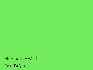 Hex #72eb5d Color is a light green color and the nearest color is Screamin Green #66ff66. Hex code #72eb5d and RGB value is rgb(114,235,93). In RGB color space, this color is composed of 45% red, 92% green, 36% blue, In CMYK color space, this color is composed of 51% cyan, 0% magenta, 60% yellow , 8% black , In HSL color space, this color has a hue angle of 111° , 78% saturation and 64% lightness.