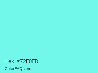 Hex #72f8eb Color is a light cyan color and the nearest color is Electric Blue #7df9ff. Hex code #72f8eb and RGB value is rgb(114,248,235). In RGB color space, this color is composed of 45% red, 97% green, 92% blue, In CMYK color space, this color is composed of 54% cyan, 0% magenta, 5% yellow , 3% black , In HSL color space, this color has a hue angle of 174° , 91% saturation and 71% lightness.