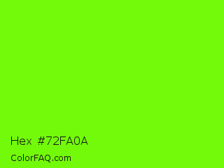 Hex #72fa0a Color is a normal green color and the nearest color is Lawn Green #7cfc00. Hex code #72fa0a and RGB value is rgb(114,250,10). In RGB color space, this color is composed of 45% red, 98% green, 4% blue, In CMYK color space, this color is composed of 54% cyan, 0% magenta, 96% yellow , 2% black , In HSL color space, this color has a hue angle of 94° , 96% saturation and 51% lightness.