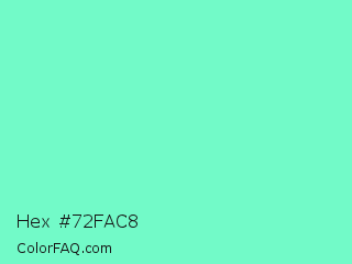 Hex #72fac8 Color is a light green color and the nearest color is Aquamarine #7fffd4. Hex code #72fac8 and RGB value is rgb(114,250,200). In RGB color space, this color is composed of 45% red, 98% green, 78% blue, In CMYK color space, this color is composed of 54% cyan, 0% magenta, 20% yellow , 2% black , In HSL color space, this color has a hue angle of 158° , 93% saturation and 71% lightness.