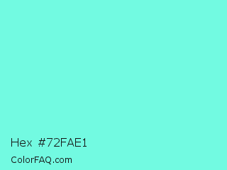 Hex #72fae1 Color is a light cyan color and the nearest color is Aquamarine #7fffd4. Hex code #72fae1 and RGB value is rgb(114,250,225). In RGB color space, this color is composed of 45% red, 98% green, 88% blue, In CMYK color space, this color is composed of 54% cyan, 0% magenta, 10% yellow , 2% black , In HSL color space, this color has a hue angle of 169° , 93% saturation and 71% lightness.