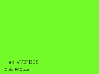Hex #72fb28 Color is a normal green color and the nearest color is Spring Frost #87ff2a. Hex code #72fb28 and RGB value is rgb(114,251,40). In RGB color space, this color is composed of 45% red, 98% green, 16% blue, In CMYK color space, this color is composed of 55% cyan, 0% magenta, 84% yellow , 2% black , In HSL color space, this color has a hue angle of 99° , 96% saturation and 57% lightness.