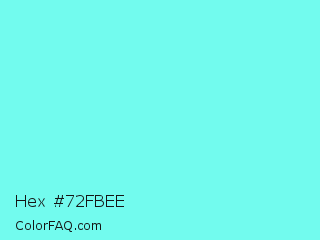 Hex #72fbee Color is a light cyan color and the nearest color is Electric Blue #7df9ff. Hex code #72fbee and RGB value is rgb(114,251,238). In RGB color space, this color is composed of 45% red, 98% green, 93% blue, In CMYK color space, this color is composed of 55% cyan, 0% magenta, 5% yellow , 2% black , In HSL color space, this color has a hue angle of 174° , 94% saturation and 72% lightness.