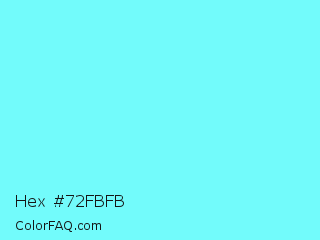 Hex #72fbfb Color is a light cyan color and the nearest color is Electric Blue #7df9ff. Hex code #72fbfb and RGB value is rgb(114,251,251). In RGB color space, this color is composed of 45% red, 98% green, 98% blue, In CMYK color space, this color is composed of 55% cyan, 0% magenta, 0% yellow , 2% black , In HSL color space, this color has a hue angle of 180° , 94% saturation and 72% lightness.