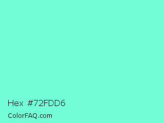 Hex #72fdd6 Color is a light green color and the nearest color is Aquamarine #7fffd4. Hex code #72fdd6 and RGB value is rgb(114,253,214). In RGB color space, this color is composed of 45% red, 99% green, 84% blue, In CMYK color space, this color is composed of 55% cyan, 0% magenta, 15% yellow , 1% black , In HSL color space, this color has a hue angle of 163° , 97% saturation and 72% lightness.