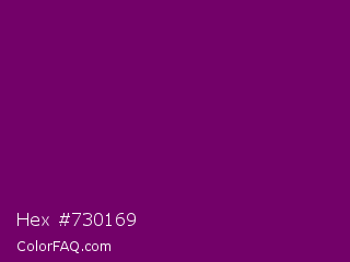 Hex #730169 Color is a dark magenta color and the nearest color is Patriarch #800080. Hex code #730169 and RGB value is rgb(115,1,105). In RGB color space, this color is composed of 45% red, 0% green, 41% blue, In CMYK color space, this color is composed of 0% cyan, 99% magenta, 9% yellow , 55% black , In HSL color space, this color has a hue angle of 305° , 98% saturation and 23% lightness.