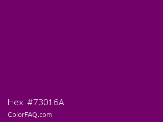 Hex #73016a Color is a dark magenta color and the nearest color is Patriarch #800080. Hex code #73016a and RGB value is rgb(115,1,106). In RGB color space, this color is composed of 45% red, 0% green, 42% blue, In CMYK color space, this color is composed of 0% cyan, 99% magenta, 8% yellow , 55% black , In HSL color space, this color has a hue angle of 305° , 98% saturation and 23% lightness.