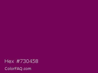 Hex #730458 Color is a dark magenta color and the nearest color is French Plum #811453. Hex code #730458 and RGB value is rgb(115,4,88). In RGB color space, this color is composed of 45% red, 2% green, 35% blue, In CMYK color space, this color is composed of 0% cyan, 97% magenta, 23% yellow , 55% black , In HSL color space, this color has a hue angle of 315° , 93% saturation and 23% lightness.