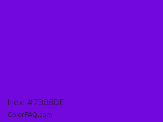 Hex #7308de Color is a normal violet color and the nearest color is French Violet #8806ce. Hex code #7308de and RGB value is rgb(115,8,222). In RGB color space, this color is composed of 45% red, 3% green, 87% blue, In CMYK color space, this color is composed of 48% cyan, 96% magenta, 0% yellow , 13% black , In HSL color space, this color has a hue angle of 270° , 93% saturation and 45% lightness.
