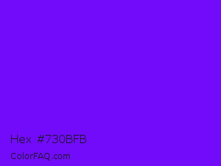 Hex #730bfb Color is a normal violet color and the nearest color is Electric Indigo #6f00ff. Hex code #730bfb and RGB value is rgb(115,11,251). In RGB color space, this color is composed of 45% red, 4% green, 98% blue, In CMYK color space, this color is composed of 54% cyan, 96% magenta, 0% yellow , 2% black , In HSL color space, this color has a hue angle of 266° , 97% saturation and 51% lightness.
