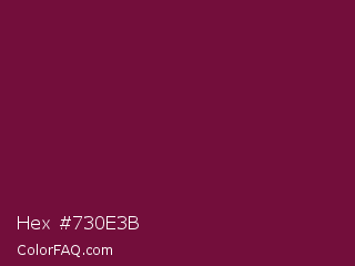 Hex #730e3b Color is a dark rose color and the nearest color is Siren #7a013a. Hex code #730e3b and RGB value is rgb(115,14,59). In RGB color space, this color is composed of 45% red, 5% green, 23% blue, In CMYK color space, this color is composed of 0% cyan, 88% magenta, 49% yellow , 55% black , In HSL color space, this color has a hue angle of 333° , 78% saturation and 25% lightness.