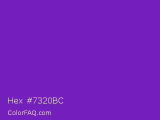 Hex #7320bc Color is a normal purple color and the nearest color is Purple Heart Crayola #652dc1. Hex code #7320bc and RGB value is rgb(115,32,188). In RGB color space, this color is composed of 45% red, 13% green, 74% blue, In CMYK color space, this color is composed of 39% cyan, 83% magenta, 0% yellow , 26% black , In HSL color space, this color has a hue angle of 272° , 71% saturation and 43% lightness.
