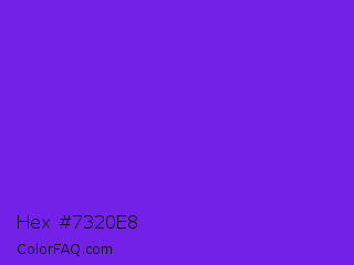 Hex #7320e8 Color is a normal violet color and the nearest color is Blue Violet #8a2be2. Hex code #7320e8 and RGB value is rgb(115,32,232). In RGB color space, this color is composed of 45% red, 13% green, 91% blue, In CMYK color space, this color is composed of 50% cyan, 86% magenta, 0% yellow , 9% black , In HSL color space, this color has a hue angle of 265° , 81% saturation and 52% lightness.