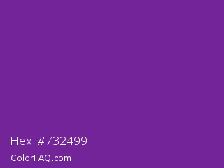Hex #732499 Color is a normal purple color and the nearest color is Seance #731e8f. Hex code #732499 and RGB value is rgb(115,36,153). In RGB color space, this color is composed of 45% red, 14% green, 60% blue, In CMYK color space, this color is composed of 25% cyan, 76% magenta, 0% yellow , 40% black , In HSL color space, this color has a hue angle of 281° , 62% saturation and 37% lightness.