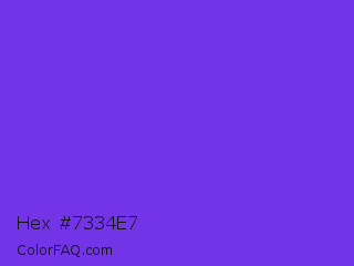 Hex #7334e7 Color is a normal violet color and the nearest color is Blue Violet #8a2be2. Hex code #7334e7 and RGB value is rgb(115,52,231). In RGB color space, this color is composed of 45% red, 20% green, 91% blue, In CMYK color space, this color is composed of 50% cyan, 77% magenta, 0% yellow , 9% black , In HSL color space, this color has a hue angle of 261° , 79% saturation and 55% lightness.