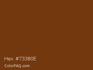 Hex #73380e Color is a dark orange color and the nearest color is Sepia #704214. Hex code #73380e and RGB value is rgb(115,56,14). In RGB color space, this color is composed of 45% red, 22% green, 5% blue, In CMYK color space, this color is composed of 0% cyan, 51% magenta, 88% yellow , 55% black , In HSL color space, this color has a hue angle of 25° , 78% saturation and 25% lightness.