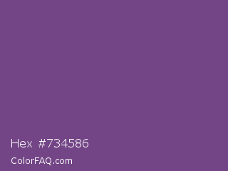Hex #734586 Color is a normal purple color and the nearest color is Affair #714693. Hex code #734586 and RGB value is rgb(115,69,134). In RGB color space, this color is composed of 45% red, 27% green, 53% blue, In CMYK color space, this color is composed of 14% cyan, 49% magenta, 0% yellow , 47% black , In HSL color space, this color has a hue angle of 282° , 32% saturation and 40% lightness.