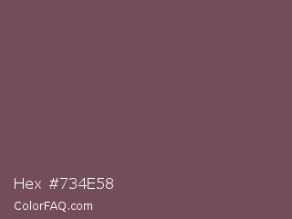 Hex #734e58 Color is a normal rose color and the nearest color is Ferra #704f50. Hex code #734e58 and RGB value is rgb(115,78,88). In RGB color space, this color is composed of 45% red, 31% green, 35% blue, In CMYK color space, this color is composed of 0% cyan, 32% magenta, 23% yellow , 55% black , In HSL color space, this color has a hue angle of 344° , 19% saturation and 38% lightness.
