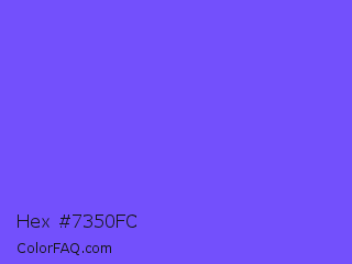 Hex #7350fc Color is a light indigo color and the nearest color is Very Light Blue #6666ff. Hex code #7350fc and RGB value is rgb(115,80,252). In RGB color space, this color is composed of 45% red, 31% green, 99% blue, In CMYK color space, this color is composed of 54% cyan, 68% magenta, 0% yellow , 1% black , In HSL color space, this color has a hue angle of 252° , 97% saturation and 65% lightness.