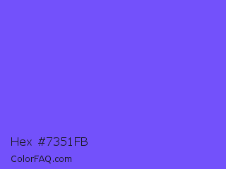 Hex #7351fb Color is a light indigo color and the nearest color is Very Light Blue #6666ff. Hex code #7351fb and RGB value is rgb(115,81,251). In RGB color space, this color is composed of 45% red, 32% green, 98% blue, In CMYK color space, this color is composed of 54% cyan, 68% magenta, 0% yellow , 2% black , In HSL color space, this color has a hue angle of 252° , 96% saturation and 65% lightness.