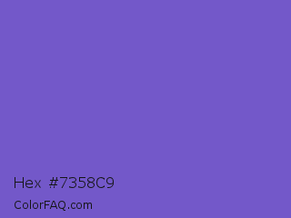 Hex #7358c9 Color is a normal indigo color and the nearest color is Slate Blue #6a5acd. Hex code #7358c9 and RGB value is rgb(115,88,201). In RGB color space, this color is composed of 45% red, 35% green, 79% blue, In CMYK color space, this color is composed of 43% cyan, 56% magenta, 0% yellow , 21% black , In HSL color space, this color has a hue angle of 254° , 51% saturation and 57% lightness.